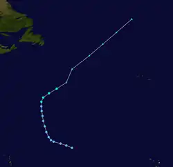 A tropical wave moved off the coast of Africa on September 18 and continued west-northwestward. It is possible that the system developed into a tropical depression the next day, although lack of data prevented such classification until September 23, when a nearby ship reported winds of 35 mph (56 km/h). An approaching cold front turned the system to the north on September 24. The structure gradually became better organized, and after turning to the northeast on September 26, the depression intensified into a tropical storm. This was based on a ship report of 45 mph (72 km/h) winds, which was also estimated as the system's peak intensity. On September 27, the system became extratropical and accelerated its forward motion, dissipating within a larger extratropical storm south of Iceland on the next day.[53]