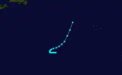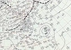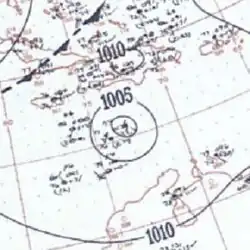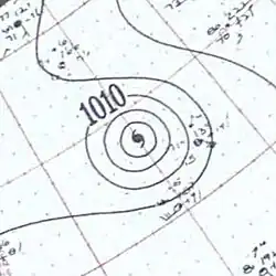 An easterly tropical wave developed into a tropical depression on August 21 in the tropical Atlantic.[4] Moving towards the west-northwest, the disturbance slowly intensified, reaching tropical storm strength at 1200 UTC on August 23 and as such was named Edith by the Weather Bureau.[7][27] Afterwards, Edith began to curve towards the northwest as it gradually intensified, attaining hurricane strength on August 26, but weakened back to a tropical storm early the next day. The storm re-intensified as it northeastward and accelerated, re-attaining hurricane status early on August 29. Edith became a Category 2 hurricane on August 30 and soon peaked with maximum sustained winds of 100 mph (160 km/h) and a minimum pressure of 967 mbar (28.6 inHg).[7] The hurricane began to gradually weaken after it passed east of the island, before becoming extratropical on August 31. The extratropical cyclone would later make a clockwise loop before dissipating completely early on September 5. Although Edith remained at sea,[7] it was suspected that the hurricane may have caused the loss of the pleasure yacht Connemara IV, after it separated from its moorings.[28]