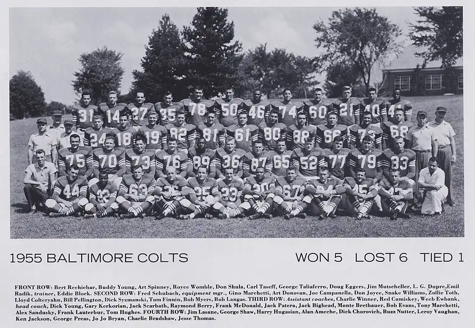 The 1955 Baltimore Colts season was the third season for the team in the National Football League. The Baltimore Colts finished the National Football League's 1955 season with a record of 5 wins, 6 losses and 1 tie and finished fourth in the Western Conference.