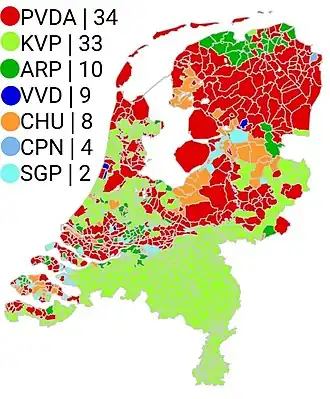 The elections led to the continuation of the four-party coalition government, consisting of the PvdA, Catholic People's Party, Anti-Revolutionary Party and Christian Historical Union.