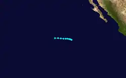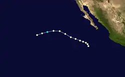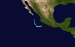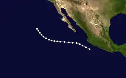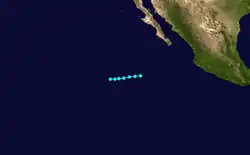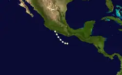 On June 11, a small low pressure system was first identified around 300 mi (480 km) south of the Gulf of Tehuantepec, producing sustained winds which neared 30 mph (50 km/h).[2] By 12:00 UTC the next day, the system intensified into a hurricane with sustained winds of 85 mph (140 km/h),[1] with nearby ship reports indicating that the storm was producing sustained gales. Moving west-northwestward slowly, on June 13, reports from the Portland Star indicated that the hurricane had deepened into a minimum pressure of 29.06 inHg (984 hPa) and was producing gusts exceeding 115 mph (185 km/h).[2] Never intensifying further than 85 mph (140 km/h), the hurricane tracked north-northwestwards prior to making landfall around 150 mi (240 km) east-southeast of Manzanillo, in the state of Guerrero.[1][2] Weakening rapidly, the hurricane was last noted on June 14.[1][2]
