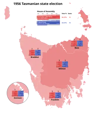 The 1956 Tasmanian state election was held on 13 October 1956 in the Australian state of Tasmania to elect 30 members of the Tasmanian House of Assembly. The election used the Hare-Clark proportional representation system[1] — six members were elected from each of five electorates.