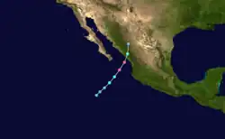 On September 17, a new hurricane was identified just off the southern coast of Mexico with winds of 85 mph (135 km/h). Moving northwestward, the storm eventually made landfall near Acapulco, Mexico at this intensity. Shortly after moving over land, the storm lost its identity.[2]