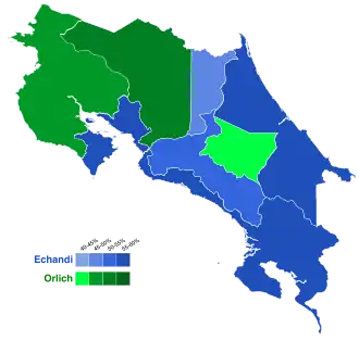 But, whilst PLN's opposition was closing lines, PLN was splitting. After a primary election that was won by Francisco José Orlich (one of PLN's founders and one of the leaders of the 1948 Revolution) his opponent Jorge Rossi left the party and founded a new one called Independent Party.[ 3] As expected, Rossi's departure and his new party caused a spoiler effect dividing the Social Democratic vote and Echandi won the election with the support of Calderonists.[ 3]