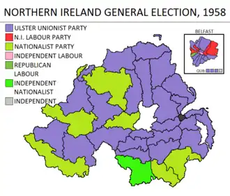 Like all previous elections to the Parliament of Northern Ireland, it produced a large majority for the Ulster Unionist Party. The Northern Ireland Labour Party returned to the Commons after being wiped out in the 1949 election.