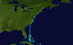 TIROS III imagery indicated a vortex east of the Bahamas between September 9 and September 12.[9] A tropical depression formed at 12:00 UTC on September 12 near Great Harbour Cay in the Bahamas,[3] after TIROS revealed a surface circulation.[9] The depression tracked northward and intensified into a tropical storm while located offshore North Carolina. Around 12:00 UTC September 14, it made landfall in the state near Topsail Beach, North Carolina, with winds of 45 mph (72 km/h). The storm curved accelerated northeastward and intensified despite mostly remaining over land, striking near the southern tip of the Delmarva Peninsula about nine hours later with winds of 50 mph (80 km/h). After re-emerging into the Atlantic late on September 14, the cyclone made landfall near Islip, New York, with peak winds of 65 mph (105 km/h) around 06:00 UTC on September 15, followed by another landfall near Guilford, Connecticut, about an hour later at the same intensity. The cyclone became extratropical over southern Maine around 12:00 UTC and quickly dissipated.[3]