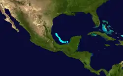 In late October, an area of low pressure persisted in the western Caribbean Sea for several days.[41] Around 00:00 UTC on October 26, a tropical depression developed about 100 mi (160 km) northeast of Colón, Panama. Approximately 12 hours later, the depression intensified into Tropical Storm Hattie. Moving towards the north and north-northeast, the storm quickly gained hurricane status early on October 28 and reached major hurricane intensity that same day. Hattie turned towards the west to the east of Jamaica and strengthened into a Category 5 hurricane with maximum sustained winds of 165 mph (266 km/h) on October 31. The storm then weakened to a Category 4 hurricane prior to landfall south of Belize City, British Honduras, with winds of 150 mph (240 km/h). Continuing southwest, the storm rapidly weakened over the mountainous terrain of Central America, dissipating on November 1.[3] It was originally thought that the remnants may have contributed to the development of Tropical Storm Simone in the eastern Pacific Ocean, but a 2019 reanalysis concluded that the remnants of Hattie instead became a Central American gyre.[6]