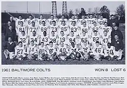 The 1961 Baltimore Colts season was the ninth for the team in the National Football League. They finished the 1961 season with a record of 8 wins and 6 losses, tied for third in the Western Conference with the Chicago Bears.