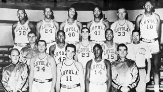 The 1962–63 Loyola Ramblers men's basketball team represented Loyola University Chicago. Champions of the 1963 NCAA tournament, the Ramblers were coached by George Ireland. They defeated top-ranked and two-time defending champion Cincinnati Bearcats in a 60–58 overtime contest. The 1962–63 Ramblers were one of the first NCAA men's basketball teams to have broken the so-called "gentlemen's agreement" among coaches in which no more than two black players would be on the floor at one time (and in some road games, black players would have to rotate so that only one of them was playing at any given moment): the Ramblers would regularly have three or four black starters, paving the way for the 1965–66 Texas Western Miners men's basketball team who would finally put the "agreement" to rest and have an all-black starting five.[1][2] They played in the Game of Change, in which a Mississippi State team defied segregationists to play against Loyola, breaking the unwritten law that Mississippi teams would not play against black players.
