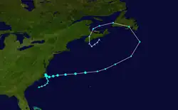 On September 29, reconnaissance aircraft indicated the formation of a tropical depression to the east of the Lesser Antilles. For several days it moved to the west-northwest, passing just north of the islands without intensifying further. This was due to its presence beneath an upper-level trough, although the system began intensifying as the trough dissipated. On October 2, after turning to the northwest between two high-pressure areas, the depression strengthened into Tropical Storm Daisy. Developing an anticyclone aloft, the storm continued to gradually intensify, reaching hurricane strength on October 3.[6] Two days later, Daisy turned to the north-northeast and attained peak winds of 105 mph (165 km/h). Cool air imparted weakening as Daisy turned northwestward, and on October 7, the storm transitioned into an extratropical about 185 mi (300 km) east of Chatham, Massachusetts. On the following day, the extratropical remnants of Daisy struck Nova Scotia just south of Yarmouth and later re-emerged into the Atlantic, before dissipating south of Newfoundland on October 9.[3]