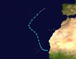 A tropical disturbance emerged from Africa in late August and developed into a weak tropical depression on August 27. For about 30 hours, the system affected the Cape Verde islands with rainfall, during which it moved slowly to the west and west-northwest. Late on August 28, it was estimated that the depression intensified into a tropical storm. The next day, satellite imagery observed a well-developed tropical cyclone in the far eastern Atlantic Ocean. In addition, a ship reported winds of force 9 on the Beaufort scale, suggesting winds of 50 mph (80 km/h). On that basis, the Weather Bureau initiated advisories on Tropical Storm Becky, despite the agency only issuing advisories for storms west of 35° W. Around that time, the storm moved over an area of anomalously warm water temperatures, which allowed for its intensification. On August 30, Becky turned to the north and northeast due to an approaching trough, becoming the easternmost cyclone since 1886 that a storm began a motion to the north. A hurricane hunters flight on August 31 indicated that Becky became extratropical about 70 mi (115 km) south of Santa Maria Island in the Azores. The storm's remnants continued to the northeast, dissipating on September 1 about 320 mi (515 km) west of Spain.[6][3]