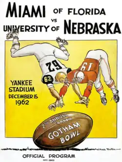 The 1962 Gotham Bowl was the second and final edition of the college football bowl game, played on December 15, 1962 at Yankee Stadium in New York City. The Nebraska Cornhuskers of the MVIAA defeated the Miami Hurricanes 36–34.