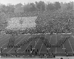 The 1963 Rose Bowl was the 49th edition of the college football bowl game, played at the Rose Bowl in Pasadena, California on Tuesday, January 1, at the end of the 1962 season. The top-ranked USC Trojans defeated the Wisconsin Badgers, 42–37.[3][4][5] The Associated Press and United Press International both awarded the national championship to USC in early December 1962, a month before the game was played, and the UPI's national championship trophy was presented to USC on the day before the game was played.[6] Nevertheless, the game remained historic as the first matchup between the AP or UPI No. 1 vs. No. 2 in a bowl game,[7] although such matchups had occurred previously in the regular season (typically referred to as a "Game of the Century"). Moreover, a five-man committee of the Football Writers Association of America voted after the Rose Bowl game and unanimously selected USC as the winner of the ninth annual Grantland Rice Award.[8]