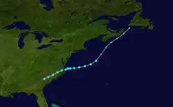 A low-pressure area formed near Columbia, South Carolina, early on July 23 and became a tropical depression. Due to its association with a mid to upper-level trough through July 25, the depression may have been a subtropical cyclone, though such a classification could not be confirmed prior to when satellite imagery became routine.[10]: 387 The depression moved east-northeastward and emerged into the Atlantic near Kitty Hawk, North Carolina, early on July 24. Several hours later, the depression intensified into a tropical storm.[3] Based on ship data and baroclinic intensification, the storm likely peaked with maximum sustained winds of 60 mph (97 km/h) just before becoming extratropical about 205 mi (330 km) of Nantucket, Massachusetts, around 12:00 UTC on July 26.[10]: 389 The extratropical remnants moved northeastward towards Atlantic Canada,[3] until another extratropical cyclone absorbed it near the south coast of Newfoundland late on July 27.[10]: 389