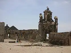 On December 23, an estimated 7.6 m (25 ft) storm surge struck the town of Dhanuskodi on the south-eastern edge of the island,[11] submerging the town and overturning the Pamban-Dhanuskodi passenger train killing all 200 passengers on board.[12] The town, an important transit point between India and Ceylon, was completely destroyed and has not been rebuilt since.[13] Prior to the cyclone, the town had been an important commercial centre with a railway station, a customs office, post and telegraphs office, two medical institutions, one railway hospital, a panchayat union dispensary, a higher elementary school and port offices.[14] A port had been functioning since 1 March 1914.[14] At least 800 people were killed in Dhanushkodi alone.[10]