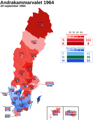 General elections were held in Sweden on 20 September 1964.[1] The Swedish Social Democratic Party remained the largest party, winning 113 of the 233 seats in the Andra kammaren of the Riksdag.[2] Tage Erlander's Social Democratic government was returned to power.