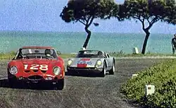 The prototype-class Porsche 718 RS Spyder driven by Jo Bonnier and Graham Hill took the lead, but had to retire during the second lap. Then the leading Porsche 904/8 of Edgar Barth and Umberto Maglioli suffered some time-wasting issue and was overtaken by the Ferrari 250 GTO '64 of Carlo Facetti and Jean Guichet, which had to retire during lap 6 for gearbox issues.[1] The Shelby Cobra's debut at the Targa Florio was disappointing as they soon proved too heavy and unwieldy for the narrow and twisty track. In the end, the podium went to 3 GT-class, with Porsche scoring a double victory with the 904 GTS of Antonio Pucci/Colin Davis and Gianni Balzarini/Herbert Linge, respectively.[1]