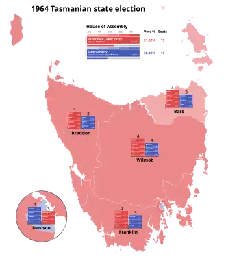 The 1964 Tasmanian state election was held on 2 May 1964 in the Australian state of Tasmania to elect 35 members of the Tasmanian House of Assembly. The election used the Hare-Clark proportional representation system[1] — seven members were elected from each of five electorates.