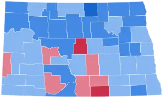 As of 2024, this is the last time that North Dakota has voted for a Democratic presidential nominee,[5] as well as the last time that a Democrat would carry the following counties: Burleigh, Ward, Stark, Williams, Stutsman, Richland, Barnes, Pembina, Bottineau, McKenzie, McHenry, Dickey, Wells, LaMoure, Bowman, Hettinger, Burke, Oliver, Billings, and Slope.[5] As of 2024 this is the final time that North Dakota voted more Democratic than South Dakota.