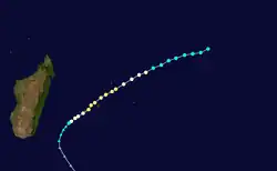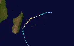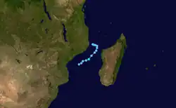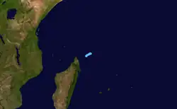On January 7, Cyclone Denise passed north of Mauritius, producing wind gusts of 170 km/h (110 mph). Later, the storm crossed over Réunion, dropping record rainfall. Over a 24-hour period, Denise dropped 1,825 mm (71.9 in) of rainfall at Foc Foc, Réunion, of which 1,144 mm (45.0 in) fell over 12 hours; both precipitation totals are the highest recorded worldwide for their respective durations. Over 48 hours, precipitation totaled 2,230 mm (88 in) at Bras Sec. The heavy rains caused flooding that killed three people, and caused severe road and crop damage.[1][2][3]