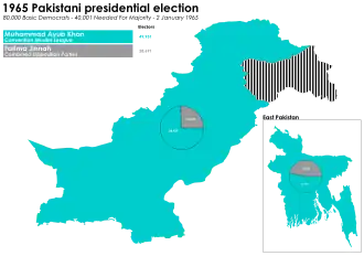 The election results came in favour of the incumbent President Ayub Khan, who, despite losing the popular vote, won 62.43% of the Electoral vote. Fatima Jinnah won 35.86% of the electoral college votes.[6] Jinnah was however extremely successful in some areas of the country. She had swept across major urban centres such as Karachi and Dhaka. Ayub also faced disappointing results in East Pakistan. However, Ayub had decisively triumphed in rural Pakistan. As majority of the Electoral College consisted of representatives from the rural setup, Ayub was able to win a clear majority.
