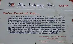A poster placed in the New York City Subway thanking riders for staying on their best behavior during the blackout. It states "When the lights went out you were at your brightest."