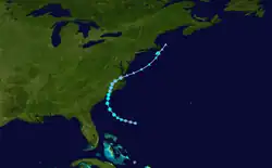 A decaying cold front led to Subtropical Storm Nine developing on September 6 off the Southeastern United States. Containing winds of 45 mph (72 km/h), it weakened to a subtropical depression on the following day, and drifted to the west-southwest before turning sharply to the northeast on September 9. That day it intensified into Tropical Storm Doria, becoming a hurricane with winds of 80 mph (130 km/h) on September 10 while 200 mi (320 km) east of the Florida–Georgia border. It briefly weakened to a tropical storm on September 11, but by the next day had already re-strengthened into a hurricane. Doria attained peak winds of 100 mph (160 km/h) on September 14, after which a ridge over New England turned the storm westward. On September 16, the hurricane weakened to tropical storm status to the south of New Jersey. At 00:00 UTC on September 17, Doria made landfall near Virginia Beach, Virginia, with winds of 60 mph (97 km/h), and it later turned southward, re-emerging into the Atlantic Ocean east of Cape Lookout as a tropical depression. It then crossed over its former path before turning eastward, dissipating on September 21 southwest of Bermuda.[3] Doria left $150,000 in minor coastal damage and killed three people when capsizing a boat offshore Ocean City, New Jersey.[4]