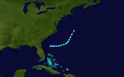 Satellite imagery and ship data indicated that Subtropical Depression Three formed at 18:00 UTC on June 14 to the northeast of the northeastern Bahamas,[4][3] associated with an upper-level low. With a ridge to the northeast, the depression moved northwestward toward the Southeastern United States.[5] Conditions were not favorable for strengthening, with cool air and minimal outflow, although the cyclone acquired gale-force winds by 12:00 UTC on August 16, becoming a subtropical storm.[4][3] Shortly thereafter the system's circulation contracted, indicative of a transition to tropical status 12 hours later. An approaching cold front turned the system northeastward on June 18.[5] At 02:00 UTC, the minimal tropical storm moved ashore near Little River Inlet, South Carolina, with winds of 40 mph (64 km/h). Weakening to a depression as it headed inland, the cyclone lost tropical characteristics by 12:00 UTC on June 22.[3] Having transitioned into an extratropical storm, its remnants continued to the northeast, restrengthening slightly to 50 mph (80 km/h) a day later. Early on June 22, the system was absorbed by the front, and continued to the northeast into Nova Scotia. The system dropped locally heavy rainfall, peaking at 8.86 in (225 mm) in North Wilkesboro, North Carolina.[5] In South Carolina, the rains caused flooding near Myrtle Beach, concurrent with 2.5 ft (0.76 m) above-normal tides, which caused $15,000 in damage, mostly to crops. Farther north, the rains were beneficial,[4] with totals as high as 6.71 in (170 mm) in Saco, Maine.[5]