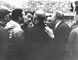 The match erupted 14 minutes later when Jimmy Johnstone was hacked down by Juan Rulli. As Johnstone writhed in pain on the ground, a melee ensued between various opposing players. John Clark approached both Rulli and Alfio Basile with his fists up, striking a pose reminiscent of a bare-knuckle boxer.[12][25] Uruguayan riot police took to the pitch to quell the ongoing disturbance. Eventually after five minutes, Racing Club's Basile and Celtic's Bobby Lennox were sent off. Initially observers believed Lennox had been sent off in a case of mistaken identity as he had not appeared to have committed any offence.[28][29] However it later became known that the referee had earlier threatened to send off Racing Club's number 6 (Basile) and Celtic's number 8 (Lennox) for the next serious offence committed by their respective sides, even if the players themselves were not guilty of the offence. Jock Stein attempted to get Lennox to stay on the field, but the Celtic player eventually was ushered off the pitch by a police officer wielding a sword.[30]