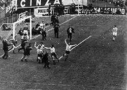 Racing Club began to take advantage as Celtic's composure and discipline disintegrated. On 48 minutes, Johnstone on being held back by Rulli, lashed out at the Argentinian in frustration and was duly sent off.[28] Six minutes later, Racing Club took the lead when Cárdenas scored from 25 yards out with a superb left-footed shot into goalkeeper Fallon's top left corner.[12][28] Celtic were reduced further in numbers after 74 minutes when John Hughes was sent off for kicking Cejas as he lay on the ground.[28] Shortly afterwards Rulli was sent off for punching Celtic's John Clark.[29] Two minutes from time, another melee erupted between the sides, resulting once again in the intervention of the Uruguayan riot police.[28] Bertie Auld was sent off, but refused to leave the field and eventually played the full match. He was however reported by the referee afterwards.[28][31] Whilst Auld refused to leave the field, amidst the total chaos on the field Tommy Gemmell kicked one of the Racing Club players in his genitals, which went unnoticed by the referee.[32] The game finished 1–0 to Racing Club, clinching the trophy for the South American champions and making them the first Argentinian holders of the Intercontinental Cup.[25][33] In total, 30 fouls were given against Celtic and 21 against Racing Club.[25] Most fouls however went unnoticed or were not called by the referee.