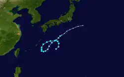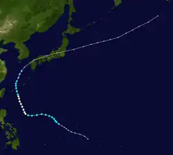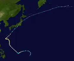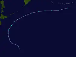 A tropical depression formed in the western Pacific on July 27. Over the next 48 hours, it tracked west-northwestward, intensifying into a tropical storm by July 29. This early phase featured steady organization, with central pressure dropping to 989 hPa by July 30. Georgia reached its peak intensity on August 1–2, with maximum sustained winds of 60 knots (110 km/h) and a central pressure of 982 hPa. The storm then executed a gradual northeastward recurvature east of the Bonin Islands. By August 2, it accelerated toward higher latitudes, maintaining tropical storm strength.