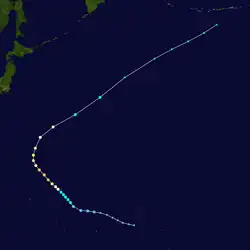 31 tropical depressions formed this year in the Western Pacific, of which 27 became tropical storms. 20 storms reached typhoon intensity, of which 4 reached super typhoon strength. No storms this season caused significant damage or deaths.
