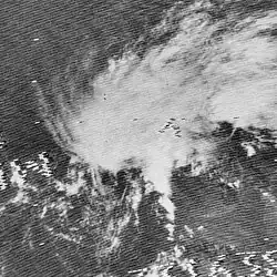 A tropical wave emerged into the Atlantic Ocean from the west coast of Africa on September 8.[4] Moving westward to west-northwestward, it developed into a tropical depression at 1200 UTC on September 14, while located about 1,250 mi (2,010 km) southeast of Puerto Rico,[2] based on Hurricane Hunter observations of an organized circulation.[39] It quickly organized and was soon upgraded to Tropical Storm Holly.[40] Continuing northwestward, it steadily intensified, and the Hurricane Hunters reported that Holly attained hurricane status on September 16,[41] with peak winds of 85 mph (137 km/h) and a minimum barometric pressure of 984 mbar (29.1 inHg).[2]