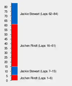 The race developed as a contest between Stewart and Jochen Rindt who constantly overtook each other by slipstreaming. It was on one of these occasions towards the end when Stewart signalled to Rindt as he drew alongside[1] that the end plate of his rear wing had come loose and was fouling the left-rear tyre each time Rindt flung his Lotus through a fast right-hander. Rindt was able to confirm this in his mirror and was forced to pit. However, his team failed to put enough fuel into the car to enable him to finish the race and consequently he was obliged to make a further stop.[2] The race was also notable for being the only race that Cosworth entered. Their car was withdrawn weeks before the race weekend.