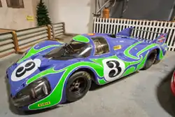The Martini Racing customer team also gained some support from Porsche AG, being the other runner of a 917L for Gérard Larrousse/ Willi Kauhsen. The spectacular livery of this car was an elaborate scheme of whirls and swoops of green on a blue background.[12] The car gained the nickname of the Hippie Car or the Psychedelic Porsche from the team and the media and started the Le Mans tradition of the “art-car” special. The final 917 was co-entered by its owner, the Finnish AAW Racing Team, and British privateer David Piper. With Gijs van Lennep as driver, that 917 had already proven very competitive through the championship year.[12]
