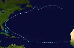On October 12, a subtropical depression developed while located northeast of the Bahamas. It steadily intensified and became a subtropical storm by the following day. After tracking east-northeastward, the storm made a sharp westward turned, followed by a curve to the north-northeast. After fully acquiring tropical characteristics, the subtropical storm transitioned into a tropical cyclone early on October 16. Twelve hours later, the storm strengthened into a hurricane,[3] shortly before passing near Bermuda.[51] It continued to intensify and briefly became a Category 2 hurricane on October 17. The hurricane then accelerated rapidly northeastward,[3] and made landfall on the Avalon Peninsula of Newfoundland as a Category 1 hurricane. Shortly thereafter, the hurricane transitioned into an extratropical cyclone on October 17.[3][52]