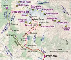 - ^ The eight-day trek route from Pokhara went up beside the Seti Khola river and then the Modi Khola (a tributary of the Gandaki river). Bonington notes passing through Naudanda, Lumle, Chondracot (now Chandrakot), Ghandrung (now Ghandruk), Chomro (now Chhomrong), Thomo and Hinko Cave.[24]