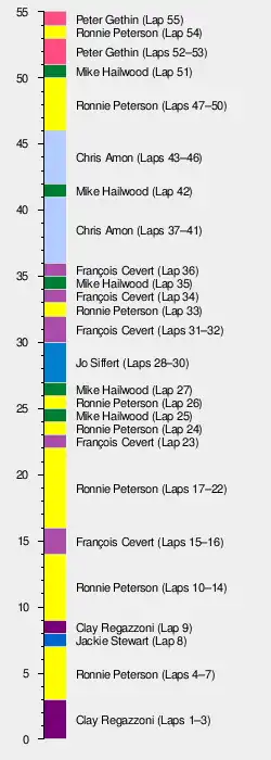 This race featured the closest finish in Formula One history, as Peter Gethin beat Ronnie Peterson by 0.01 seconds.[3] The top five were covered by just 0.61 seconds, with François Cevert finishing third, Mike Hailwood fourth and Howden Ganley fifth. With an average speed of 242.615 km/h (150.754 mph), this race stood as the fastest-ever Formula One race for 32 years, until the 2003 Italian Grand Prix at Monza.[4]