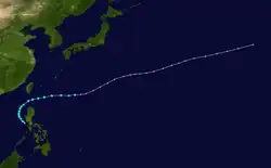 During January 8, the JMA started to monitor a tropical depression that had developed, about 500 km (310 mi) to the east of Ngerulmud, Palau.[3] Over the next day the system gradually developed further as it moved north-westwards, before it was classified as a tropical storm and named Sarah by the JTWC, after a US Navy plane had found an organised system.[3][4] The system subsequently recurved north-eastwards, before it was classified as a Severe Tropical Storm by the JMA during January 10.[5] During that day, the JTWC reported that the system had peaked, with 1-minute sustained wind-speeds of 95 km/h (60 mph).[4] Over the next day, the system quickly weakened and became an extratropical cyclone during January 11.[4] Sarah's extratropical remnants were subsequently tracked as they moved north-eastwards, until it made landfall on Canada and broke up over the mountains of British Columbia during January 17.[4]