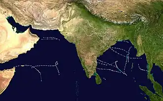 The 1972 North Indian Ocean cyclone season was part of the annual cycle of tropical cyclone formation. The season had no official bounds, but cyclones tend to form between April and December. These dates conventionally delimit the period of each year when most tropical cyclones form in the northern Indian Ocean. There are two main seas in the North Indian Ocean—the Bay of Bengal to the east of the Indian subcontinent and the Arabian Sea to the west of India. The official Regional Specialized Meteorological Centre in this basin is the India Meteorological Department (IMD), while the Joint Typhoon Warning Center (JTWC) releases unofficial advisories. An average of five tropical cyclones form in the North Indian Ocean every season with peaks in May and November.[1] Cyclones occurring between the meridians 45°E and 100°E are included in the season by the IMD.[2]
