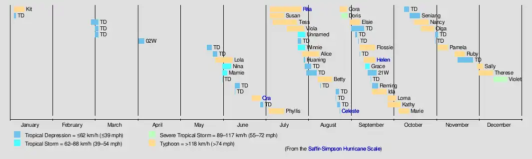 A total of 36 tropical depressions formed this year in the Western Pacific, of which 30 became tropical storms. Twenty-two storms reached typhoon intensity, of which two reached super typhoon strength.[1]