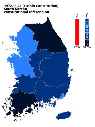 A constitutional referendum was held in South Korea on 21 November 1972.[1] President Park Chung-hee had suspended the constitution and dissolved the National Assembly in October. Work began almost immediately on a new constitution. The finished product, the Yushin Constitution, was a severely authoritarian document that dramatically expanded the president's powers and allowed him to run for an unlimited number of six-year terms. For all intents and purposes, the document concentrated all governing power in Park's hands.