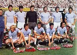 Back to Serie A in 1973, Lazio immediately emerged as surprise challengers for the Scudetto to Milan and Juventus previous season, only losing out on the final day of the season, with a team comprising captain Giuseppe Wilson, as well as midfielders Luciano Re Cecconi and Mario Frustalupi, striker Giorgio Chinaglia who led the top Italian league in scoring with 24 goals, and head coach Tommaso Maestrelli.[2] Lazio improved such successes this season, ensuring its first title in 74 years.[3][4][5] [6] [7] [8]