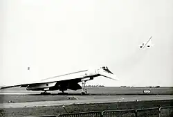 By 1975, the Soviet aviation industry had pivoted to promotion of new conventional subsonic airliners, the Yakovlev Yak-42 and Ilyushin Il-86.[21] Restrictions on the Tu-144 following the Paris Air Show crash meant that it only saw limited service during 1977 and 1978, and it was finally withdrawn following another crash in May 1978.[5] The Tu-144's rival, the Concorde, went on to serve with British Airways and Air France for 30 years afterwards, being finally withdrawn from service in 2003 due to low passenger numbers following the crash of Flight 4590 (coincidentally also within the vicinity of Le Bourget), rising service costs and the slump in the aviation industry following the September 11 attacks.[22]