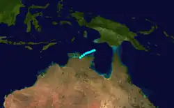 Cyclone Tracy devastated the city of Darwin, Northern Territory, Australia, from Christmas Eve to Christmas Day, 1974. It is the most compact cyclone or equivalent-strength hurricane on record in the Australian basin, with gale-force winds extending only 48 kilometres (30 mi) from the centre and was the most compact system worldwide until Tropical Storm Marco of the 2008 Atlantic hurricane season broke the record, with gale-force winds extending only 19 kilometres (12 mi) from the centre.[3][4] After forming over the Arafura Sea, the storm moved southwards and affected the city with Category 4 winds on the Australian cyclone intensity scale, while there is evidence to suggest that it had reached Category 3 on the Saffir–Simpson hurricane scale when it made landfall.[5]
