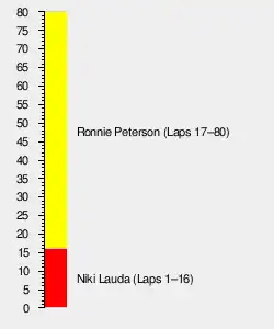 The 80-lap race was won by Ronnie Peterson, driving a Lotus-Ford. Niki Lauda finished second in a Ferrari, having started from pole position, with teammate Clay Regazzoni third. Until the 2020 Sakhir Grand Prix, this was the only World Championship Grand Prix in which lap times of less than one minute were set, by 12 drivers during qualifying, including pole position starter Lauda.[3]