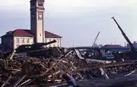 With approvals and funding falling in place, one last challenge was transforming the site and removing the railroads. Through intense negotiations, the Expo '74 planners, including King Cole were miraculously able to convince the railroads to agree to a land swap and donate the land needed for the Expo site.[21][20][2][19] The railroads were consolidated onto the Northern Pacific Railway lines further to the south in Downtown Spokane,[11] freeing up the site for construction. Construction that would transform the site to host the environmentally-themed Expo '74 began with the removal of a ceremonial "first spike" at a ground-breaking ceremony on May 8, 1972.[22] The Great Northern depot on Havermale Island and Union Pacific on Spokane Falls Boulevard were both demolished early the following year despite protests from preservationists.[23][24]