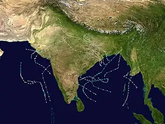 The 1975 North Indian Ocean cyclone season was at the time, the most active cyclone season on record until it was beaten out 12 years later. The season has no official bounds but cyclones tend to form between April and December. These dates conventionally delimit the period of each year when most tropical cyclones form in the northern Indian Ocean. There are two main seas in the North Indian Ocean—the Bay of Bengal to the east of the Indian subcontinent and the Arabian Sea to the west of India. The official Regional Specialized Meteorological Centre in this basin is the India Meteorological Department (IMD), while the Joint Typhoon Warning Center (JTWC) releases unofficial advisories. An average of five tropical cyclones form in the North Indian Ocean every season with peaks in May and November.[1] Cyclones occurring between the meridians 45°E and 100°E are included in the season by the IMD.[2]