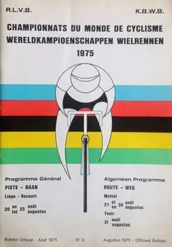 The 1975 UCI Track Cycling World Championships were the World Championship for track cycling. They took place in Rocourt, Belgium in 1975.[1] Eleven events were contested, 9 for men (3 for professionals, 6 for amateurs) and 2 for women.