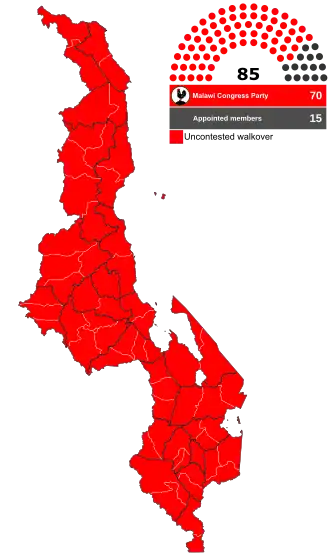 Banda's Malawi Congress Party had been the only legally permitted party since 1966. Each of the 70 constituencies had a maximum of five candidates proposed by at least two registered voters and nominated by MCP committees. All prospective candidates had to declare their allegiance to Banda in order to stand. These candidates' names were then submitted to Banda, who personally vetted the prospective candidates before selecting a single candidate for each constituency. As a result, no voting took place on election day and all 70 candidates were returned unopposed.[1][2][3]